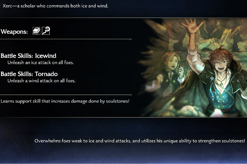 È uno studioso che trascorre le sue giornate studiando le pietre dell’anima e la maggior parte delle persone nel mondo accademico lo vedono un po’ strano a causa della sua ossessione. Man mano che sblocchi le sue abilità di supporto, diventa ancora più utile in battaglia. La sua prima abilità aumenta il potere di tutte le pietre dell’anima che usi, facendole colpire più forte. Successivamente, può aumentare l’attacco elementale di un personaggio di 50 e, con ulteriori progressi, può anche aumentare i suoi SP massimi di 50.