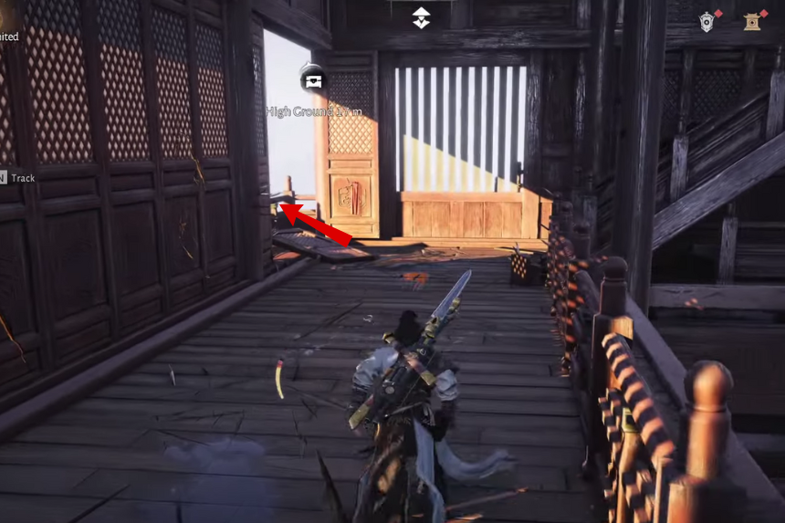 Una volta dentro, prendi le scale alla tua sinistra e seguile fino a raggiungere un vicolo cieco. Da lì, guarda ancora a sinistra e dovresti notare un balcone aperto con alcune rampe di legno che portano verso l’alto. Sali quelle rampe e raggiungi il punto rialzato davanti a te.