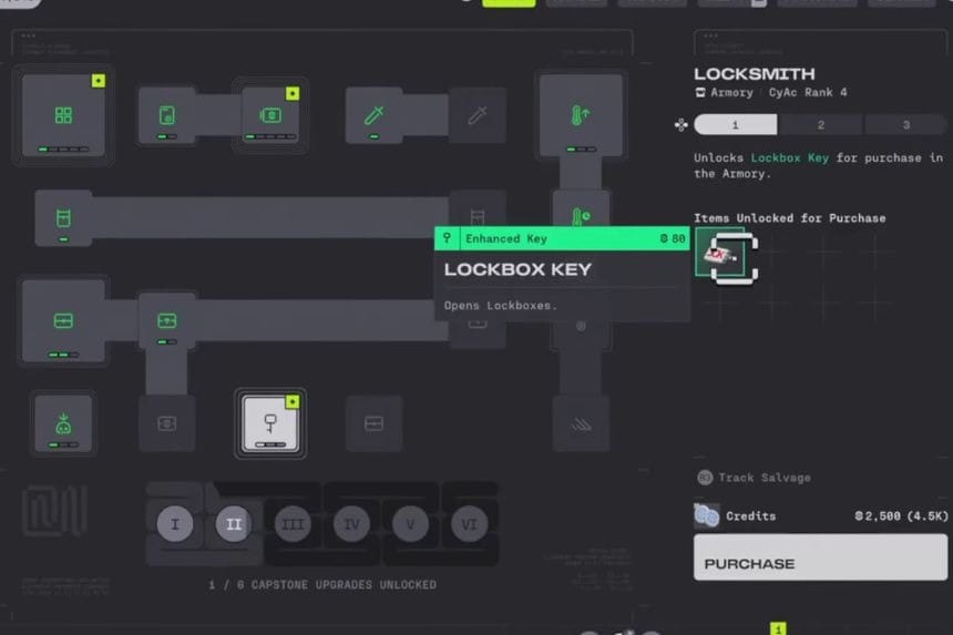 Prima di poter aprire le cassette di sicurezza, devi raccogliere le chiavi delle cassette di sicurezza. Il metodo più semplice è tramite gli aggiornamenti della fazione Maida. Una volta raggiunto il grado 4, puoi sbloccare un aggiornamento che ti dà le chiavi.