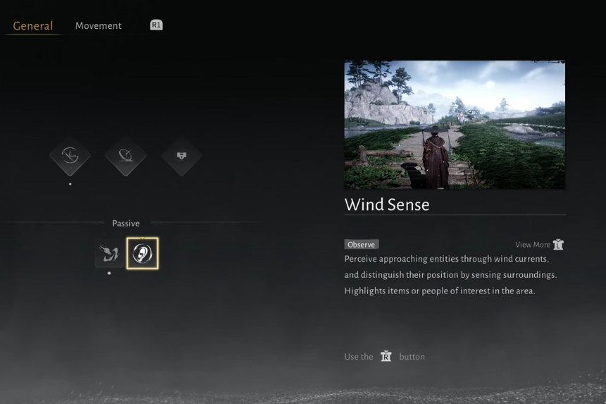 Wind Sense ti dà un’idea dell’ambiente interpretando il vento. Quando lo usi, il gioco ti indica le cose importanti che si trovano nelle vicinanze, come oggetti, oggetti nascosti o persone che dovresti notare. Ti avvisa su tutto ciò che si avvicina o che vale la pena guardare. Non sono richiesti gradi o potenziamenti aggiuntivi per Senso del vento; funziona sempre allo stesso livello una volta ottenuto.