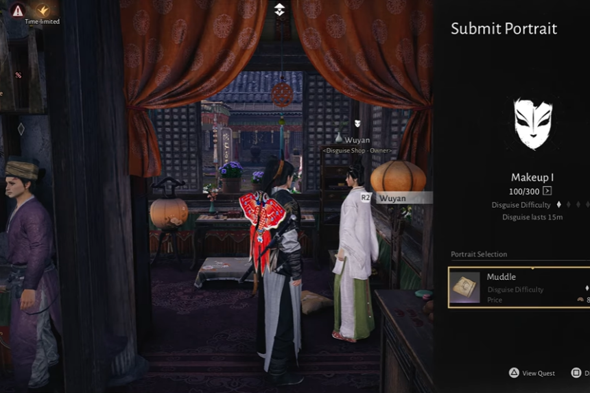 Successivamente, visita il negozio di Fang Wenxiu e dalle il dipinto. Ritorna da Wuyan in modo che possa farti assomigliare a Fang Wenxiu. Successivamente, vai a parlare con Qiao Shanlang e chiedigli la bustina di giada per completare questa missione. Ciò ti consente di accedere al sistema di travestimento, utile mentre cerchi di oltrepassare le guardie nella Sala Marziale. Dovresti avvicinarti di nuovo all’anziano fuori e chiedergli il piano di infiltrazione. Poi vai da Muddle, che sta bevendo qualcosa lì vicino, e scatta il suo ritratto.