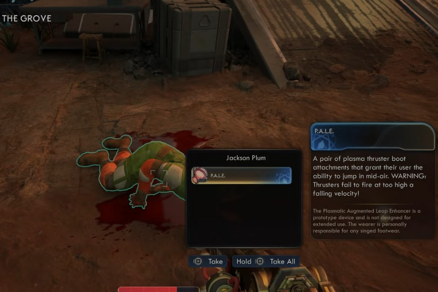 Dovrai saccheggiare il soldato morto per il pezzo di equipaggiamento che stai cercando: un PALE (Plasmatic Augmented Leap Enhancer). Semplicemente afferrandolo, recupererai la tua capacità di saltare di nuovo a mezz’aria. Scoprirai anche un gruppo di schemi sullo stesso cadavere che ti torneranno utili in seguito.