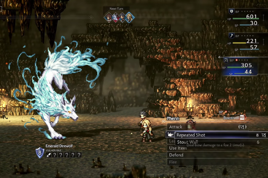 Quando combatti contro il metalupo di smeraldo, il tiro ripetuto di Phenn è la migliore abilità di supporto che puoi usare. Questa abilità toglie due punti scudo contemporaneamente, permettendoti di rompere lo scudo del Metalupo più velocemente e di colpire molto più forte in seguito. A volte il boss si “prepara” per un grande attacco, che puoi facilmente individuare quando appare un’aura viola attorno a lui. Nel momento in cui vedi quel bagliore, spara di nuovo Colpo ripetuto per interrompere l’attacco e stordire il Metalupo per alcuni turni. Questo dà al tuo gruppo il momento perfetto per infliggere danni extra. Dato che il Metalupo può colpire molto velocemente e molto forte, dovrai tenere d’occhio la salute di tutti. Ogni volta che qualcuno scende sotto la metà degli HP, lascia che Stia intervenga con il Pronto Soccorso per mantenere il gruppo al sicuro e in piedi.