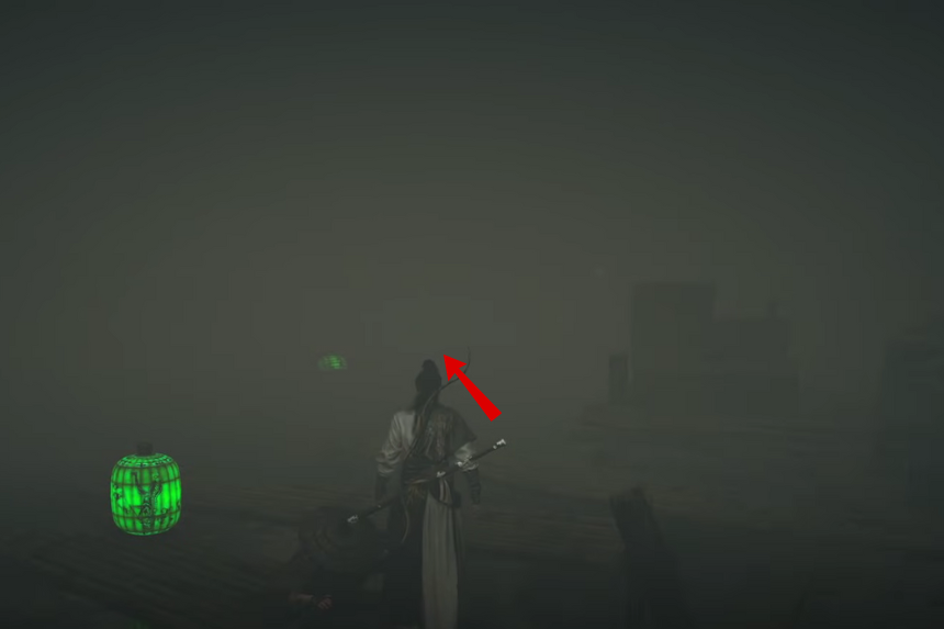 Continua fino a raggiungere un’area simile a un molo. Qui vedrai delle lanterne verdi che galleggiano sopra l’acqua. Segui queste lanterne e ti guideranno fino a una roccia alla fine del sentiero. C’è una cassa sopra di esso; apritelo per ottenere l’armatura.
