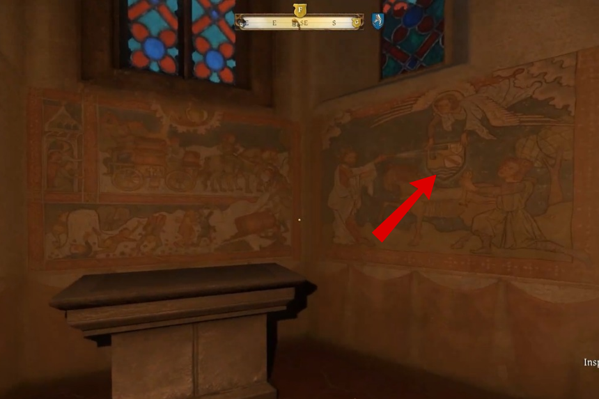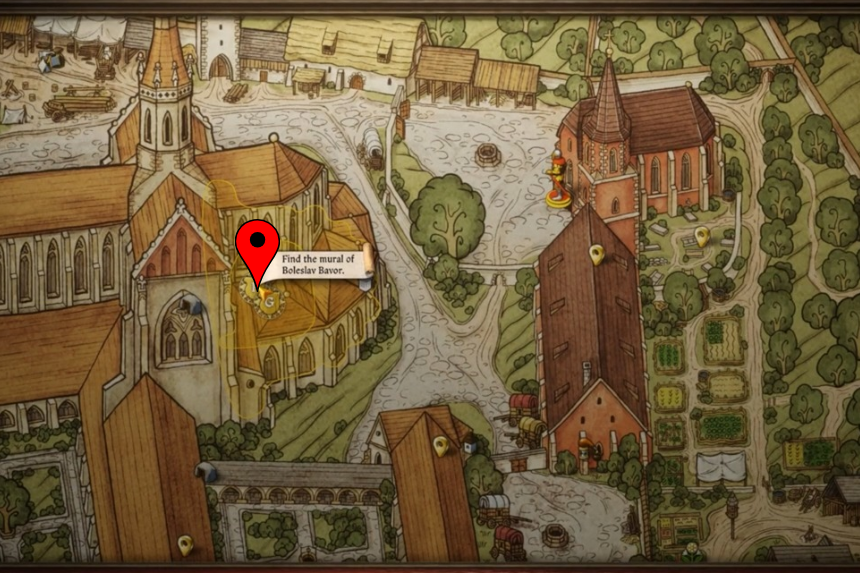 Per vedere lo schizzo, controlla il tuo inventario in Libri > Mappe. Presta particolare attenzione al simbolo dello stemma (una freccia che punta in alto a sinistra), poichĂ© ti aiuterĂ a trovare il murale all’interno della chiesa. Il murale che stai cercando si trova al piano principale della chiesa, sotto le finestre orientali che venivano utilizzate per la preghiera. Cerca il terzo murale da destra, di un angelo che regge lo stemma di Bavor. Una volta che interagisci con il murale, dovresti ricevere uno scudetto, di cui avrai bisogno in seguito per aiutarti a trovare la reliquia quando Crispin ti manderĂ al cimitero con la tomba di Boleslav che è vicino all’infermeria.