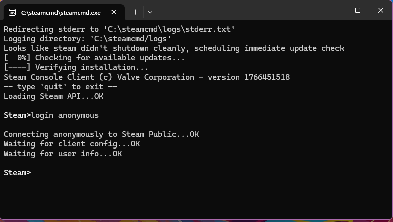 - Esegui steamcmd.exe e lascialo aggiornare