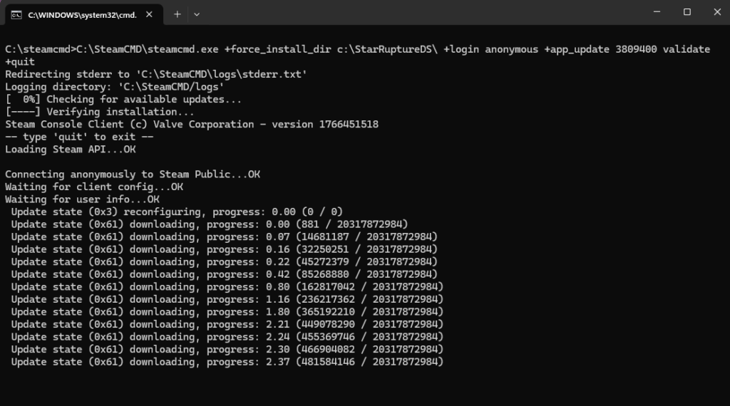 C:\SteamCMD\steamcmd.exe +force_install_dir c:\StarRuptureDS\ +login anonymous +app_update 3809400 validate +quit
