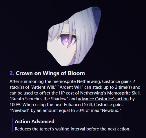 Con 2 accumuli di Volontà Ardente, Alafatua può scatenare due soffi aggiuntivi di “Il Soffio Brucia l’Ombra”. L’evocazione di Alafatua fa avanzare l’azione di Castorice del 100%, consentendole di infliggere danni abilità potenziati significativi. Il guadagno garantito del 30% di Newbud assicura che Castorice abbia bisogno solo del 70% per evocare Netherwing, consentendo evocazioni successive più rapide.