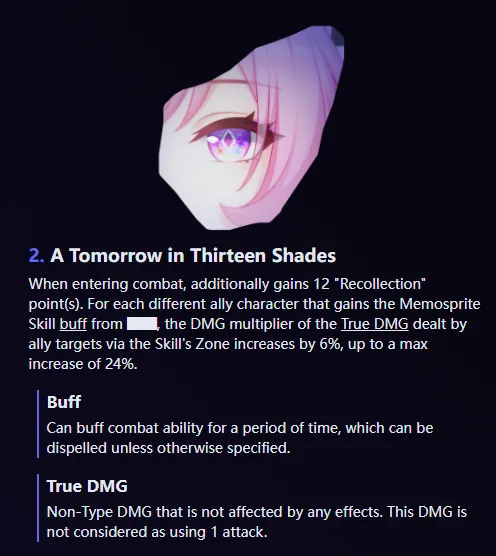 E1: Aumenta il danno inflitto da tutti i memosprite alleati proporzionalmente in base al numero di nemici sul campo, fornendo un potenziamento significativo negli scenari a bersaglio singolo (fino al 150%). Questo Eidolon appartiene ad una categoria di moltiplicatori di danno indipendente, aumentando direttamente il danno inflitto dai memosprite in base al valore originale. Il potenziamento viene regolato dinamicamente in base al numero di nemici e passa immediatamente al livello successivo quando i nemici vengono sconfitti. Ad esempio, in uno scenario con 1 boss e 4 servitori, nel momento in cui un servitore viene sconfitto, il moltiplicatore del danno sale istantaneamente dal 120% al 150%.