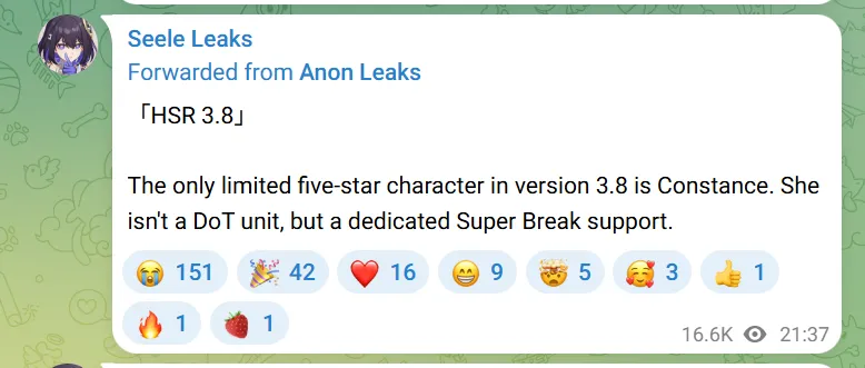 Secondo Seele, Constance debutterà come unico personaggio limitato a 5 stelle nella versione 3.8. È un membro della “Ever-Flame Mansion” e ha un elegante stile di ispirazione gotica.