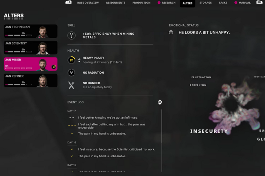 Se decidi di aggiungere Jan Miner Alter alla tua squadra in The Alters, noterai presto che ha a che fare con seri problemi psicologici. Dopo un po’, inizierà a chiedere più farmaci per far fronte all’intenso dolore fantasma. Può farcela per un po’, ma alla fine le cose peggioreranno e potrebbe anche avere un incidente. Se non intervieni, potrebbe morire a causa di uno, non importa quale lavoro gli dai.