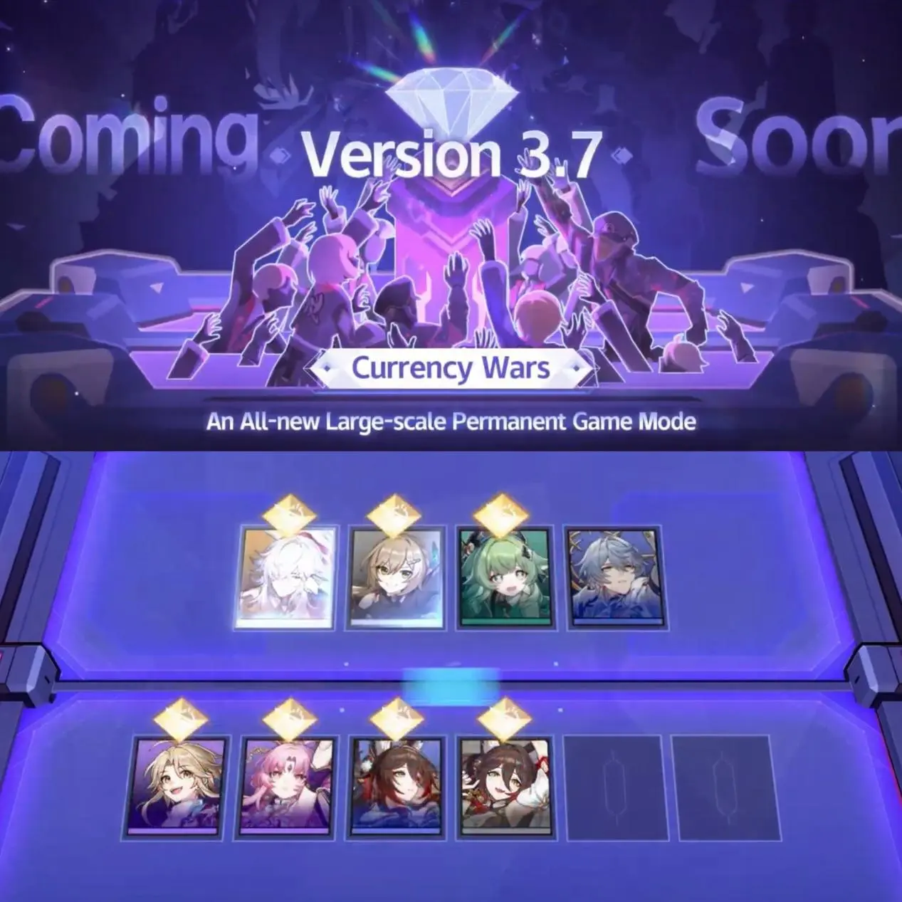 Valuta Guerre è stata anticipata durante il livestream 3.6 e dovrebbe arrivare come modalità di gioco permanente su larga scala nella versione 3.7. L’annuncio lo inquadra come un sandbox per la sperimentazione di squadra: il trailer e lo spettacolo di copertura iniziale Squadre da 10 persone, posizionamento in prima/ultima fila e abilità e legami esclusivi della modalità che premiano combo di personaggi specifici.