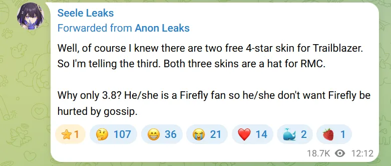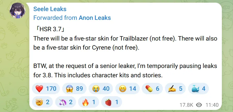 Secondo i leak di Anon, avremo le skin di Cyrene e Trailblazer nel banner 3.7! Con le nuove informazioni entusiasmanti, Anon annuncia anche che non divulgherà temporaneamente informazioni su HSR 3.8 per proteggere Firefly dai pettegolezzi.