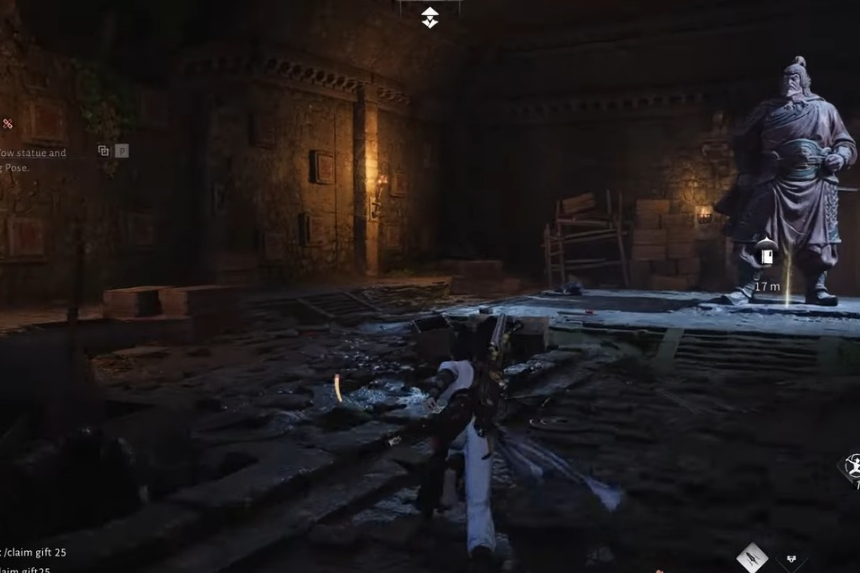 Seguire la nuova apertura verso il basso. Non molto all’interno incontrerai il corpo di un soldato: interagisci con esso per imparare una posa. Continua fino a raggiungere un’enorme statua. Per sbloccare il puzzle successivo, esegui la posa del Giuramento di Yanyun di fronte ad esso. Questo attiva il puzzle del muro di blocchi di pietra.