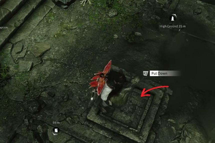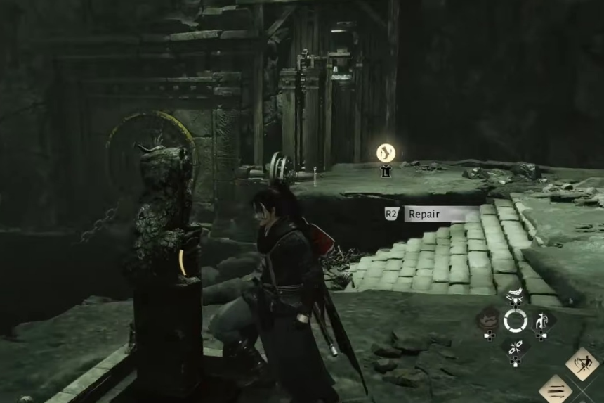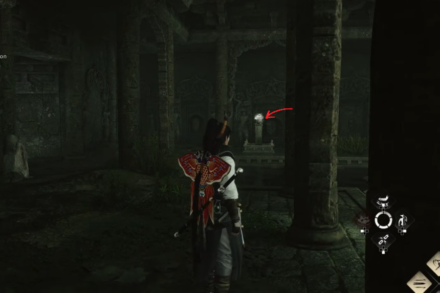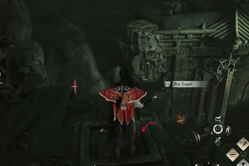 Per mantenere l’acqua che scorre, prendi la statua e posizionala sulla piastra a pressione. Dopo aver attivato il flusso d’acqua, cammina verso il bordo della piattaforma e colpisci il Tai Chi a distanza per allinearlo con i segni gialli sulla ruota.
