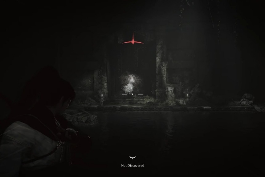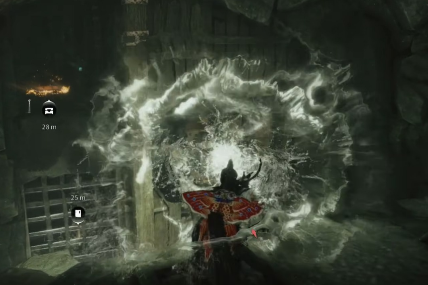 Dopo l’apertura del portale successivo, troverai un’altra ruota idraulica. Ma non vi scorre ancora l’acqua, perché accanto c’è una fontana che deve essere riparata. Nuota attraverso l’acqua e attiva la pietra di confine, quindi inizia a esplorare l’area. La posizione della parte della fontana necessaria per il fissaggio si trova a destra. Puoi raggiungere quest’area cadendo nella piscina o passando attraverso il muro e seguendo il percorso sottostante.