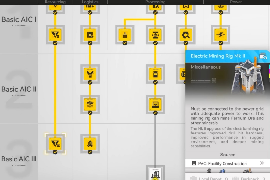 - Dovrai sbloccare Basic AIC lll e Mining lll per utilizzare l’Electric Mining Rig MK ll, necessario per estrarre il minerale di ferro.