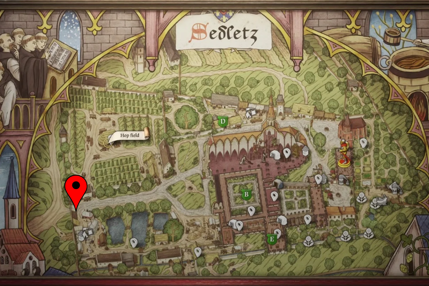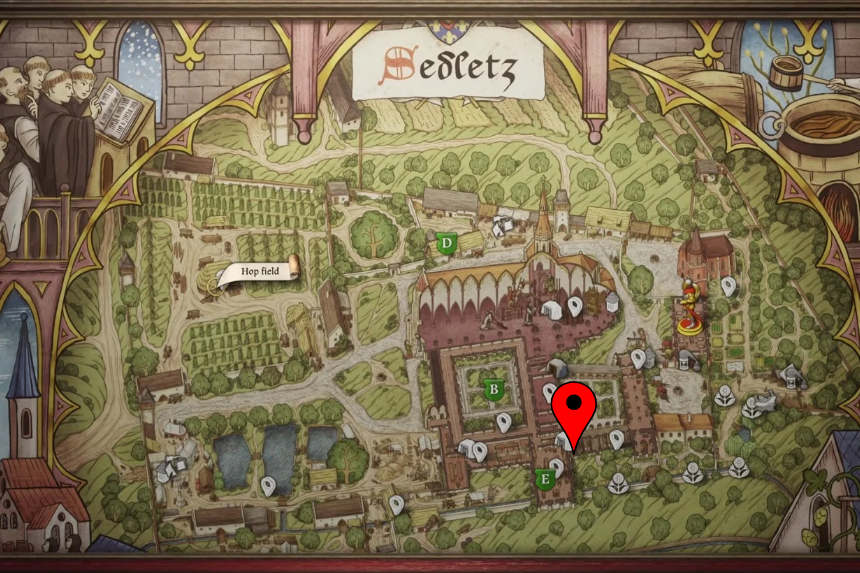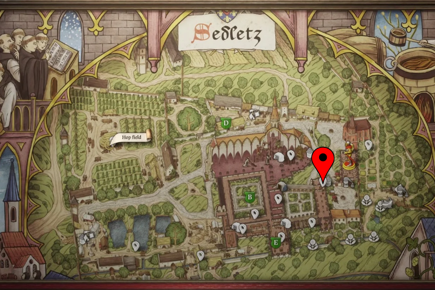 Apri la mappa e ingrandisci completamente. Appena ad ovest dell’infermeria troverai una piccola cappella rappresentata da un angelo che regge una bilancia. Dirigetevi verso quella cappella. Attraversa il cortile occidentale nella cappella e dietro l’altare troverai le cartelle cliniche di re Venceslao. Questa scoperta pone le basi per le scelte future.