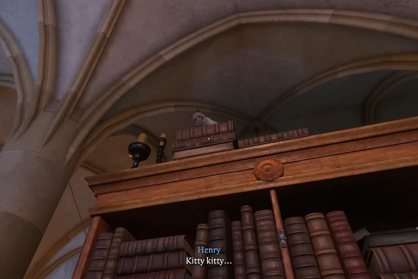 Durante la tua permanenza in biblioteca, potresti ricordarti di interagire con il gatto nell’angolo in fondo a sinistra adiacente all’ultimo scaffale. Per fare ciò, cammina il più lontano possibile finché non vedi il messaggio “Kitty kitty…”, quindi seleziona quel messaggio per chiamare il gatto. Questa azione conta per il trofeo Affetto felino. Se non vedi il messaggio, prova a salvare e ricaricare il gioco.