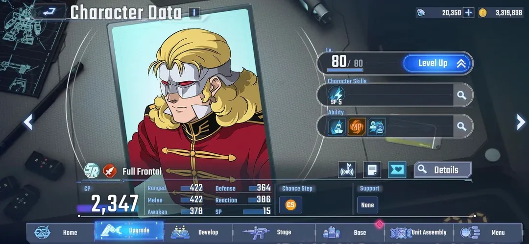 Full attualmente vanta la statistica corpo a corpo più alta tra i piloti di supporto, pur mantenendo statistiche di tiro rispettabili, che gli conferiscono un profilo statistico generale molto solido. Il suo comando spirituale include un potenziamento del tiro, che gli consente di apportare danni significativi anche in un ruolo di doppio supporto. Con un bonus passivo all’attacco di supporto, è adatto a pilotare il Guerriero Rosso e a partecipare attivamente all’inflizione dei danni. Tuttavia, con l’introduzione del Corpo Kou, la sua posizione nel meta è stata notevolmente compressa.