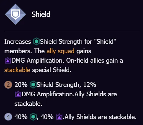 Ottiene 1 “Armatura prodotta in batch”. La squadra alleata ottiene il 15% di mitigazione del DAN e il 5% di forza dello scudo. |