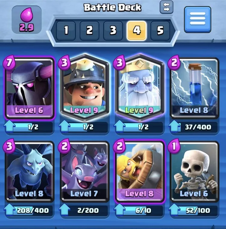 Anche il totale delle carte in questo mazzo è 8 e hanno un ciclo abbastanza economico ma un danno alla torre costante. Questo mazzo è ideale per i giocatori a cui piace esercitare una pressione costante sulle torri. Anche il costo medio dell’elisir è 3, che è alla portata della maggior parte dei giocatori. Le carte Palla di fuoco e Scarica possono eliminare sciami offensivi così rapidamente che i tuoi avversari non avranno nemmeno la possibilità di respirare.