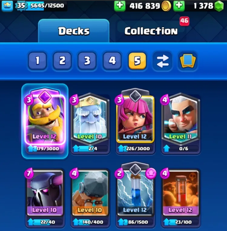 Con un totale di 8 carte in questo mazzo, potresti facilmente costringere gli avversari a sprecare i loro incantesimi e far punire i loro errori. Questo è meglio per i giocatori i cui leggendari sono ancora deboli. Anche il Cavaliere e lo Spirito del ghiaccio possono fornire uno scudo, mentre Inferno aiuta a sciogliere i serbatoi. Anche il costo medio degli elisir è solo 3,3, il che li rende facilmente disponibili.