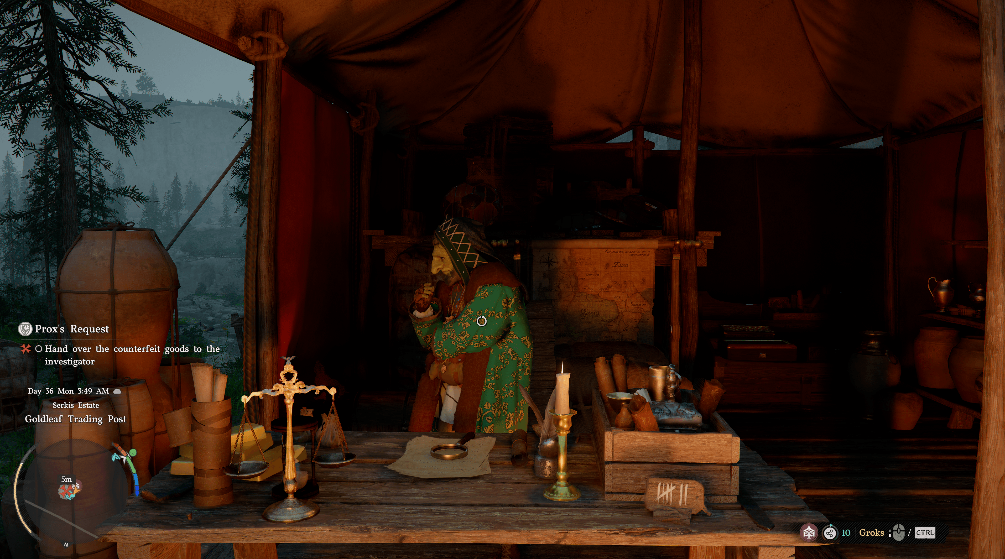 - Parla con Prox, il mercante goblin all’accampamento. Ti chiederà di consegnare merci contraffatte (dipinti caligrafici) a un investigatore presso un campo di mercanti di Goldleaf.