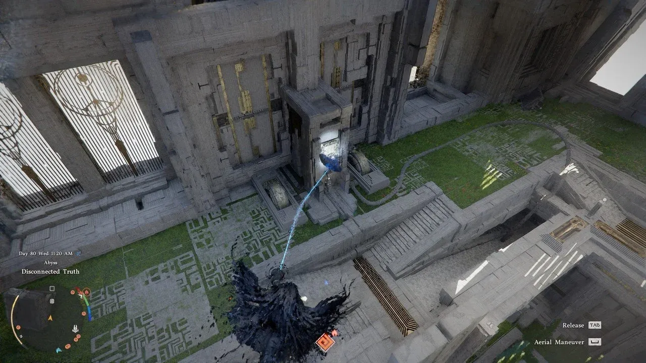 Dall’Abyss Nexus, cerca la piccola piattaforma attaccata al pilastro illuminato di giallo direttamente di fronte a te. Saliteci sopra e usate Axiom Force sulla presa nel pilastro. Si apre una vista dall’alto in cui è possibile spostarsi tra i pilastri utilizzando le funzioni Successivo e Precedente. Il pilastro selezionato viene evidenziato in blu. Premi Aziona per tirare la piattaforma verso di essa.