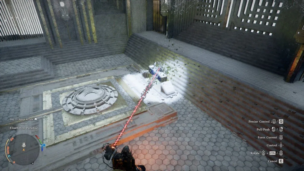 - Una volta dentro, esegui un Force Palm puntato a terra per colpire l’interruttore sul pavimento (o l’ingranaggio centrale, come descritto nella fonte DualShockers). Ciò ripristina il potere nell’Abisso.
