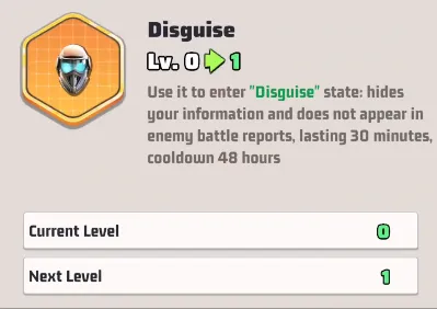 - Travestimento: nasconde le tue informazioni e ti esclude dai resoconti delle battaglie nemiche. Altamente tattico per l’esplorazione, gli attacchi a sorpresa o per nascondere la forza.