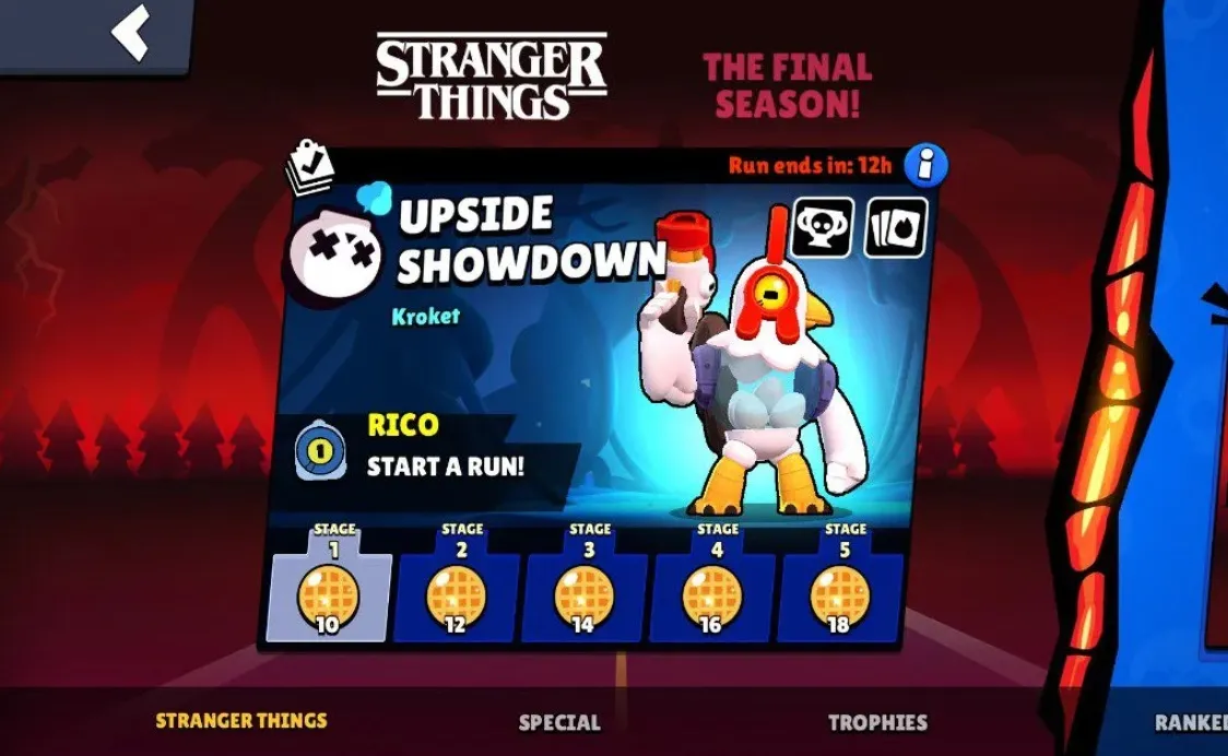 Il fulcro dell’evento inizia con l’Upside Showdown, uno showdown in solitario a tema evento in cui combatterai attraverso 5 livelli contro 9 giocatori. Il completamento di ogni fase ti ricompenserĂ con Waffle e la possibilitĂ di scegliere 1 potere tra 3 per potenziare l’abilitĂ del tuo Brawler per la fase successiva. Per avanzare alla fase successiva, devi classificarti tra i primi 4 giocatori di ogni fase e, in caso contrario, verrĂ ripetuta la stessa fase. Ecco i premi per ogni grado: