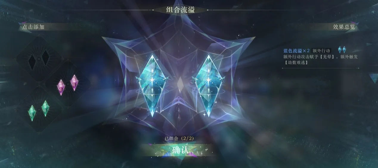 - Cristallo blu: Fornisce una probabilità del 33% per cristallo di attivare un ulteriore attacco successivo, “Destino inevitabile · Azure Overflow” (traduzione non ufficiale), dopo l’attivazione del normale “Destino inevitabile”.