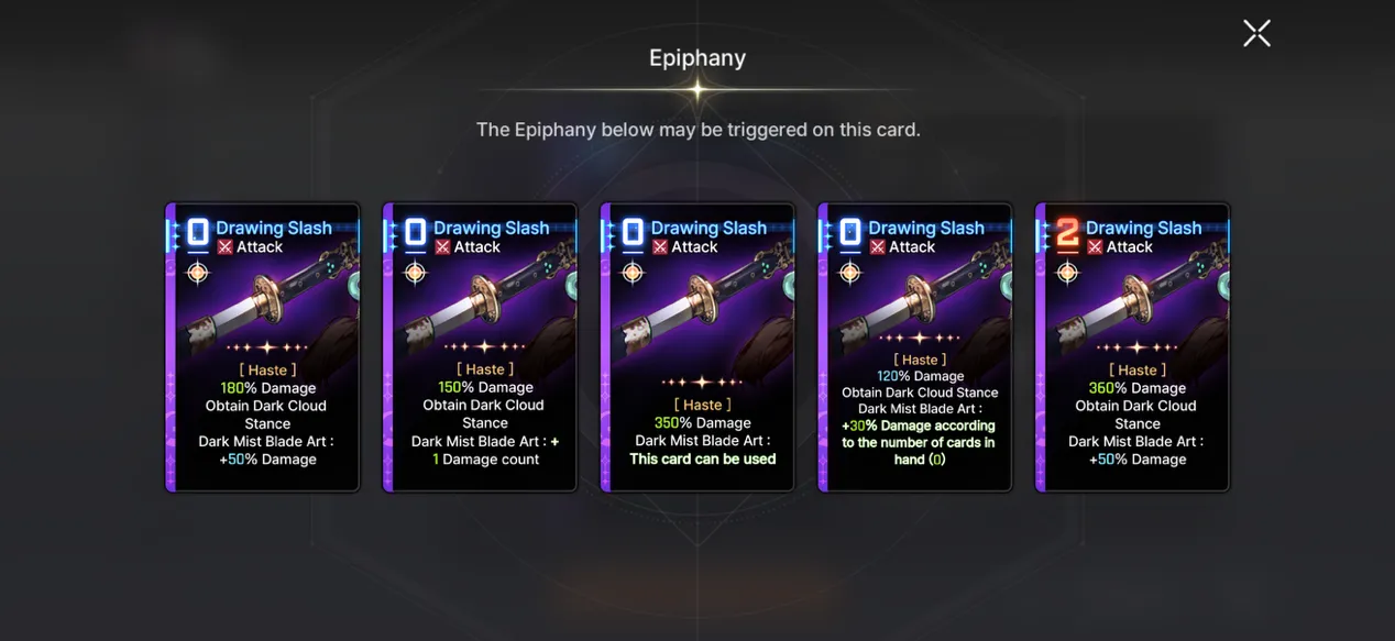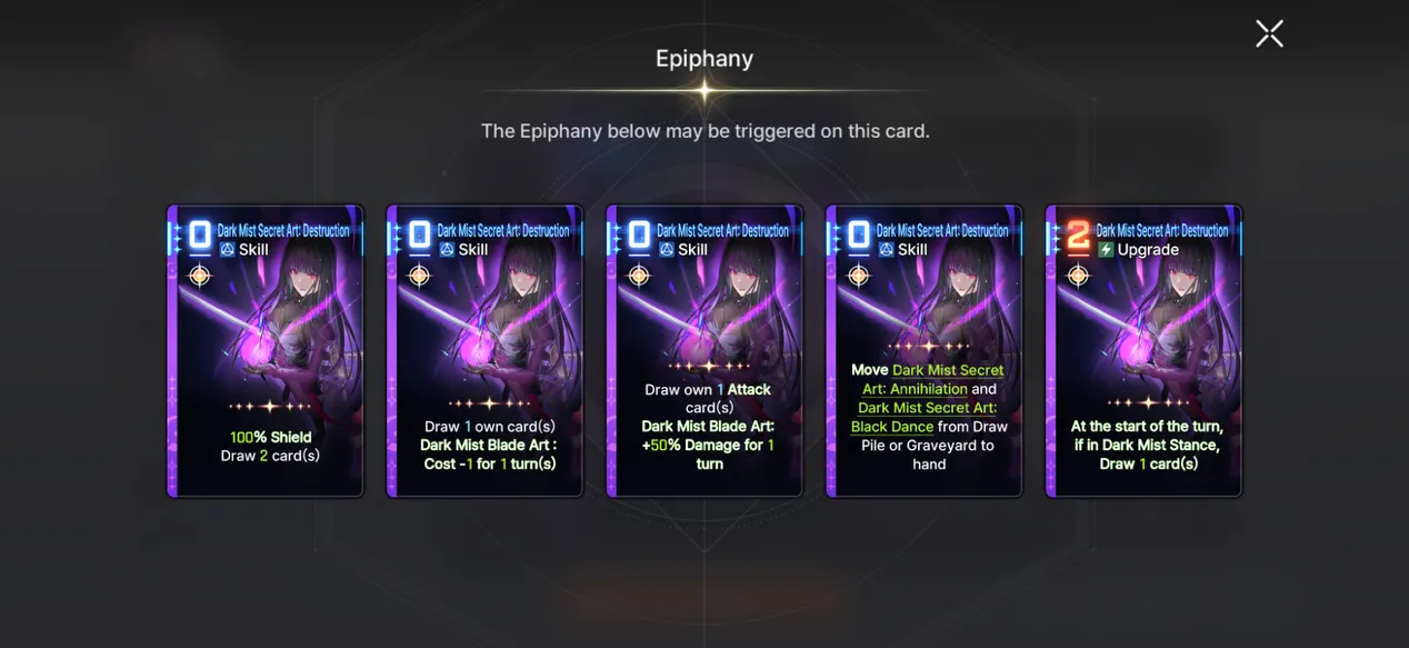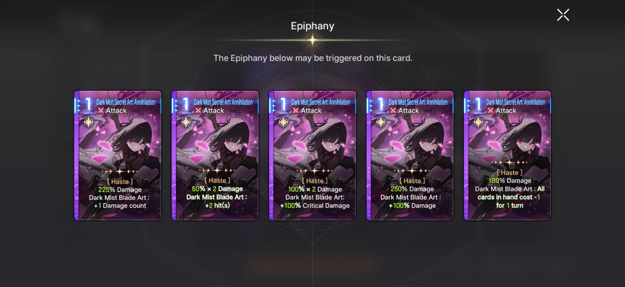 - Arte segreta della Nebbia Oscura: Annientamento (attacco a costo 1): Fretta attributo, danno del 150%. Dai priorità agli effetti dell’Epifania che aumentano il numero di colpi o riducono il costo della mano.