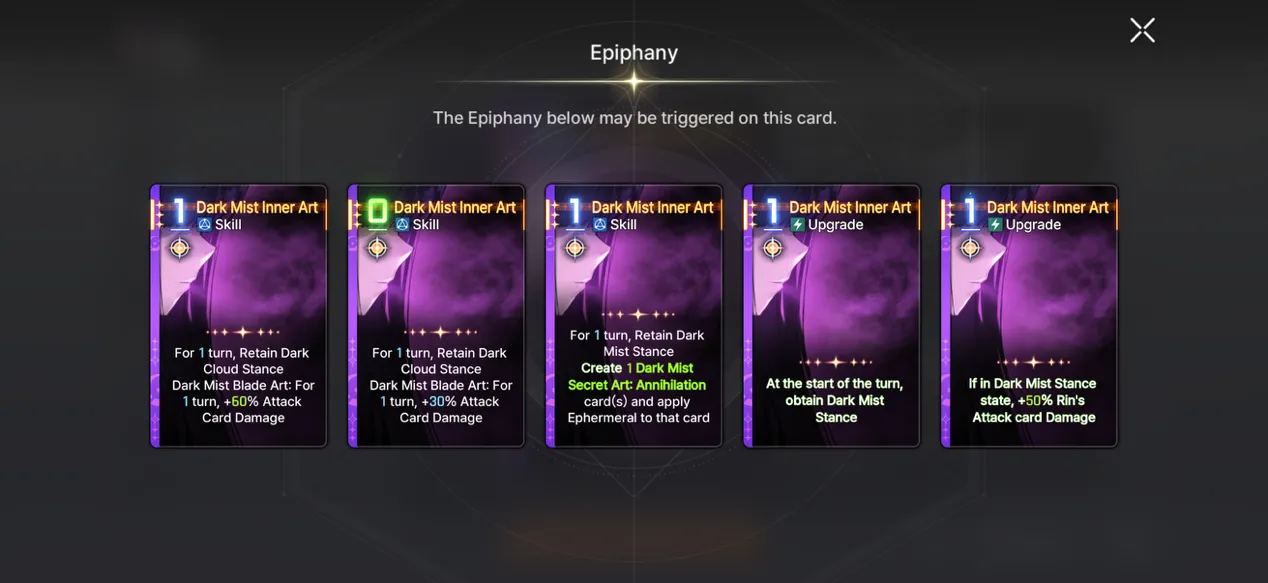 - Arte interiore della nebbia oscura: Dai priorità alle Epifanie che aumentano il danno delle carte Attacco per un aumento del danno stabile.