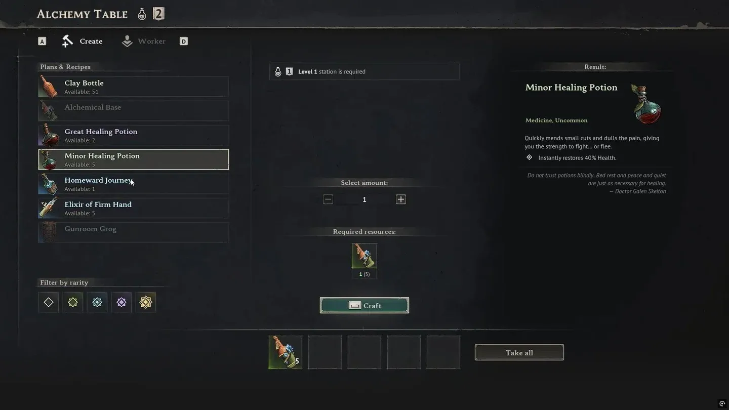 Lo schema qui è semplice: più lenta è la guarigione, più economica è la nave. Le bende costano un singolo pezzo di tessuto grezzo e sono la tua ancora di salvezza per il primo giorno. Le Grandi Pozioni Curative sono l’opzione nucleare per quando un combattimento va di traverso.