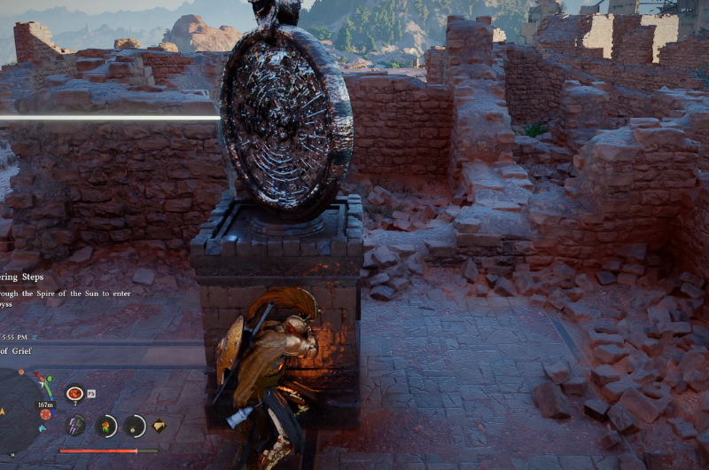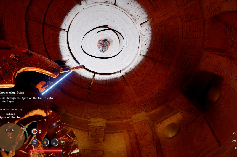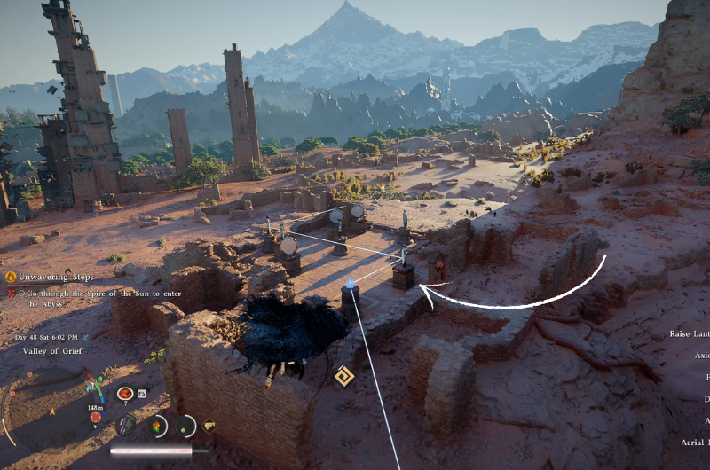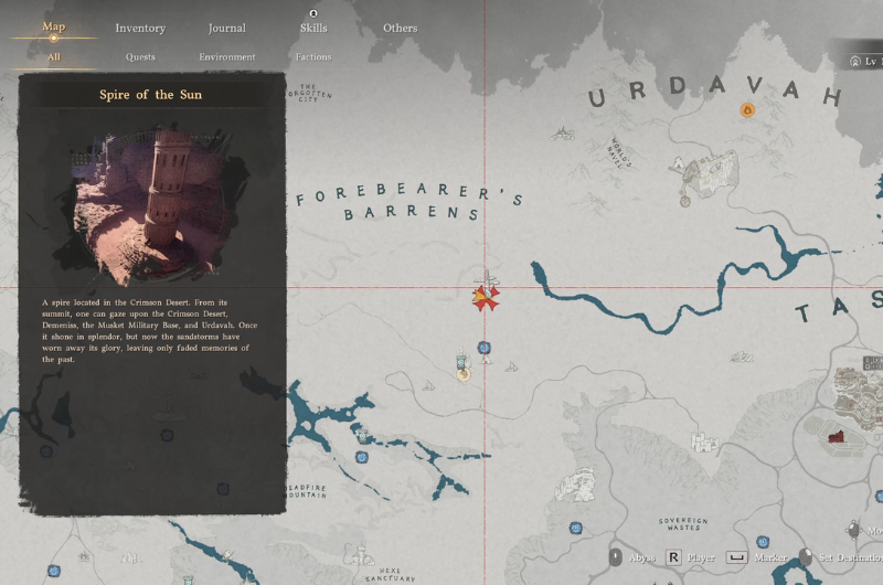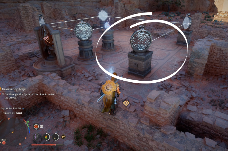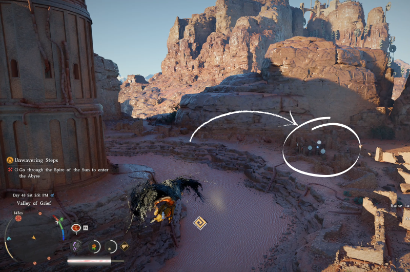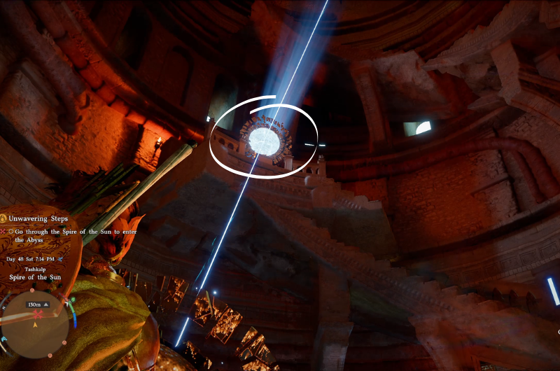 Dirigiti verso la posizione sopra mostrata sulla mappa che si trova a nord di Città di Burhum In Deserto Cremisi regione. IL Guglia del Sole non è possibile accedervi finché non si è passati a Capitolo 9 della questline principale. E la guglia è chiusa con a specchio E leggero meccanismo che deve essere risolto per poter accedere alla Guglia.
