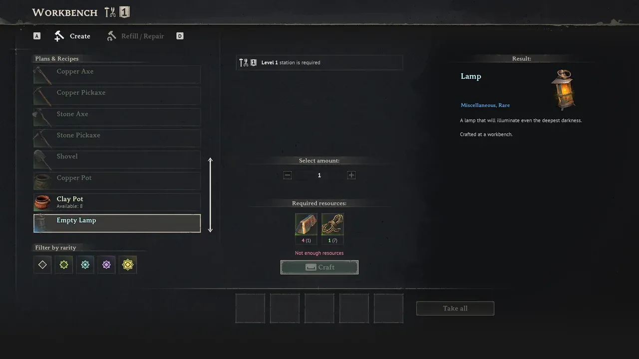SÌ. Dopo aver raccolto la lampada originale dal forziere decrepito, la ricetta di lavorazione si sblocca al banco da lavoro. Una nuova lampada vuota costa 4 lingotti di rame e 1 corda. Non avrai bisogno di crearne uno a meno che non perdi l’originale, ma è bene sapere che esiste un’opzione.