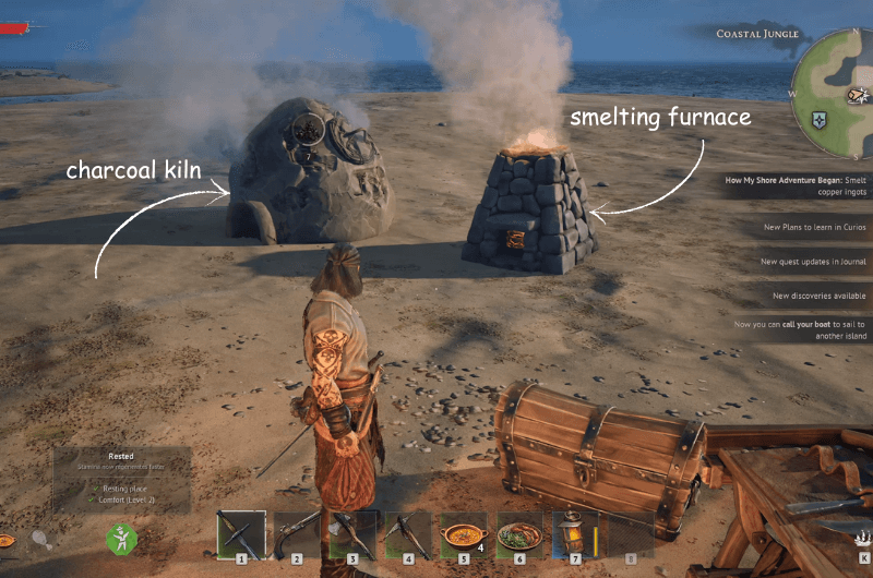 Quindi imposta a forno a carbone E forno fusorio. Usa il forno a carbone per fare carbone utilizzando il legno. Quindi usa il legno e i minerali di rame per realizzarlo lingotti di rame attraverso il forno fusorio. Con questo ora hai le risorse necessarie per creare a pala.