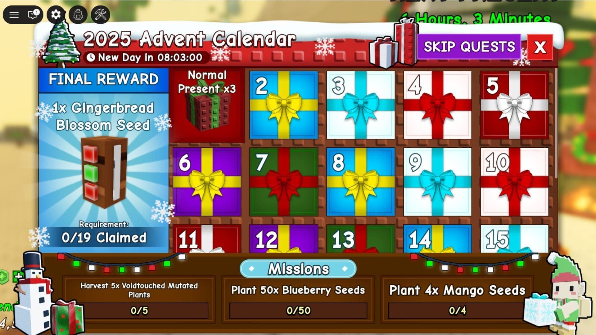 I regali vengono generati ogni 10 minuti. Per rivendicarli, i giocatori inviano piante mutate di Natale. Ogni mutazione contribuisce con punti verso un livello regalo specifico. Una volta riempita la barra, la ricompensa viene assegnata immediatamente.