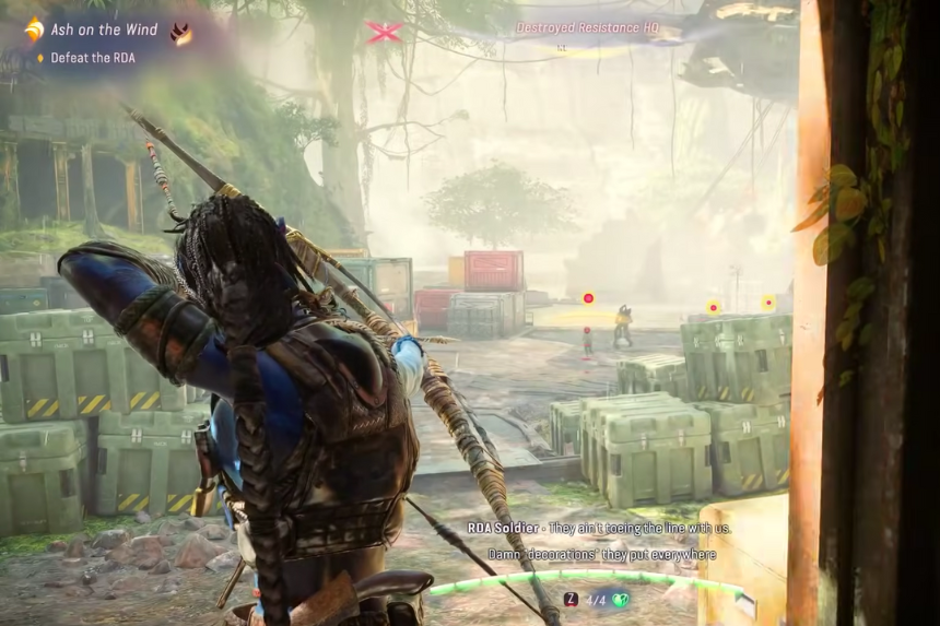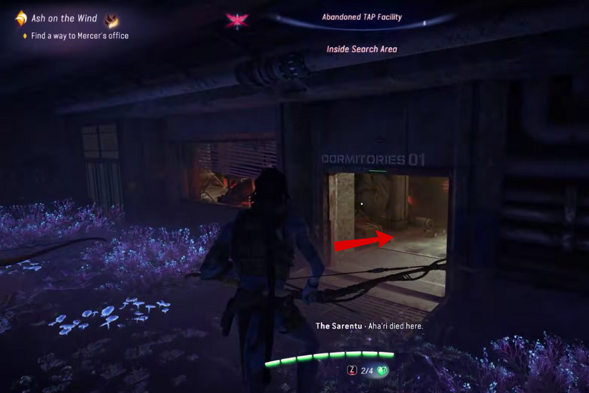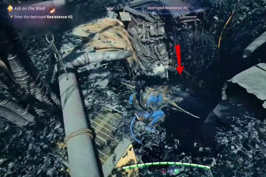Entra nel quartier generale distrutto della Resistenza e indaga sul Feral Viperwolf morto sul lato sinistro. Usa i tuoi sensi Na’vi per esplorare la zona. Mentre avanzi, troverai un fucile delle dimensioni di Navi. Devi indagarlo.