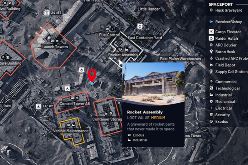 Per la seconda posizione, vai nell’area con i grandi propulsori a razzo appena fuori dal Rocket Assembly sulla mappa dello spazioporto. Puoi trovarlo dirigendoti a nord-est dalla Torre di controllo A6. Una volta raggiunti i propulsori, avvicinati e interagisci con loro per completare l’obiettivo.