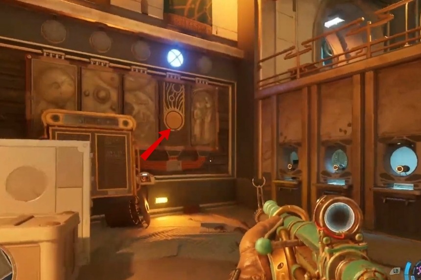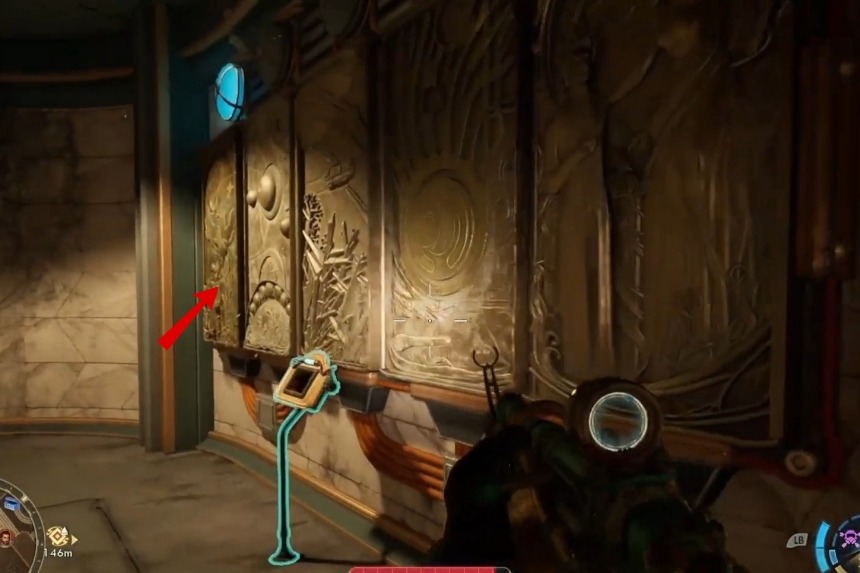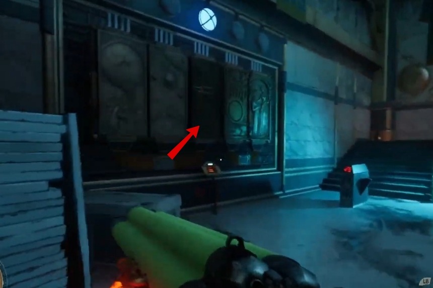 Alla fine troverai un ascensore che ti riporterà nell’area aperta dietro l’ingresso chiuso. Prima di partire, controlla la stanza adiacente. C’è una linea del tram crollata qui, e la tessera murale attende all’interno della stazione all’estremità opposta. Raccoglilo.