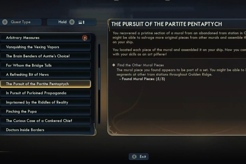 La caccia ai cinque murales in The Outer Worlds 2 diventa una piccola e sottile caccia al tesoro artistica in tutta Golden Ridge. Non c’è un donatore di missioni o indicatori: raccogline uno e l’attività inizierà da sola. Ogni murale si trova all’interno di una fermata del tram e raccoglierli non solo realizza una bellissima opera d’arte per la tua nave, ma aumenta anche di livello il vantaggio Appassionato d’arte nel processo.