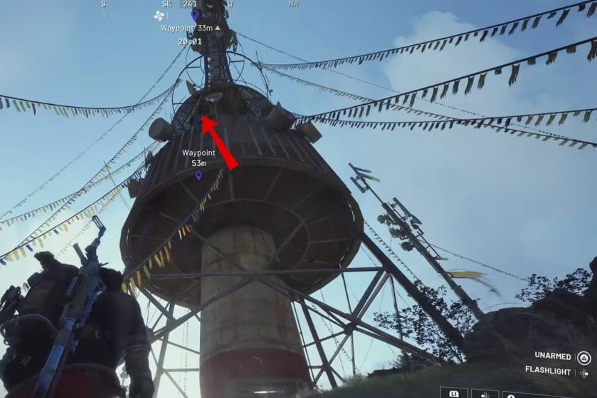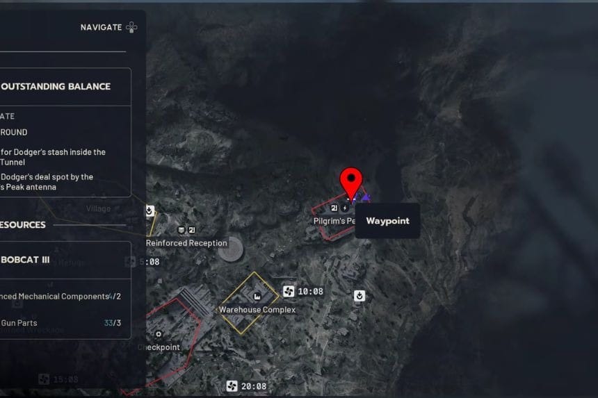 Una volta completato l’obiettivo, spostati a Pilgrim’s Peak per completare il secondo obiettivo. Per arrivare al Pilgrim’s Peak, cerca un’alta torre in quella zona. Una volta arrivato in quella posizione, spostati verso l’antenna principale e percorri la zipline ad essa collegata per muoverti verso l’alto. Dopo aver raggiunto la cima, percorri la zipline per passare al livello inferiore.