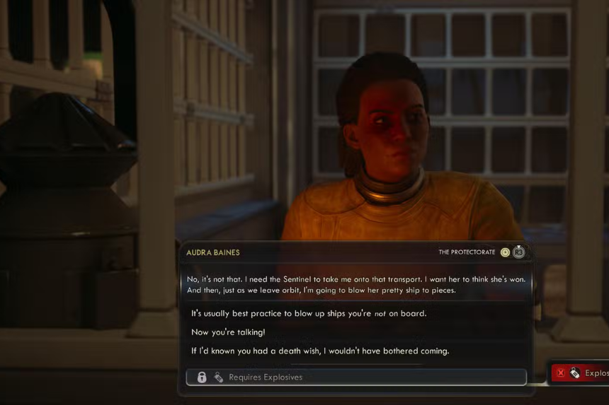 Puoi anche chiamare una guardia che abbia la chiave della cella, ma anche quando la apri Audra non se ne andrà. Dopo aver ringraziato per l’ultima volta, la nave esplode, distruggendo lei e gli ufficiali del protettorato.