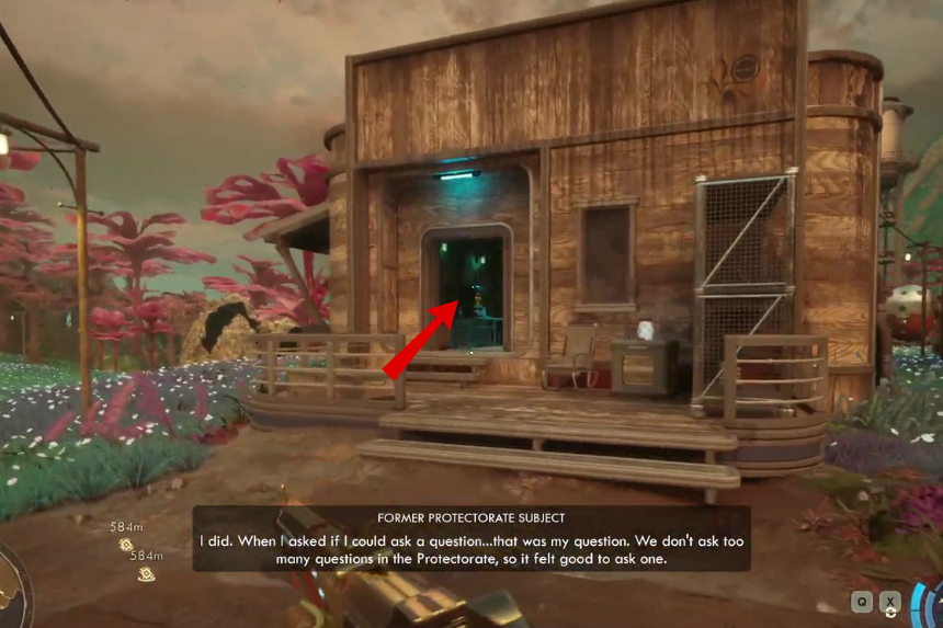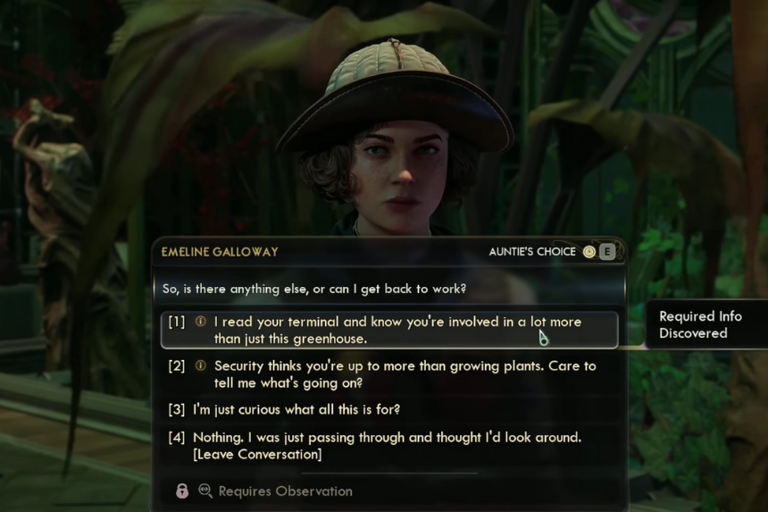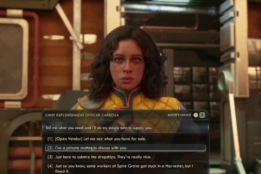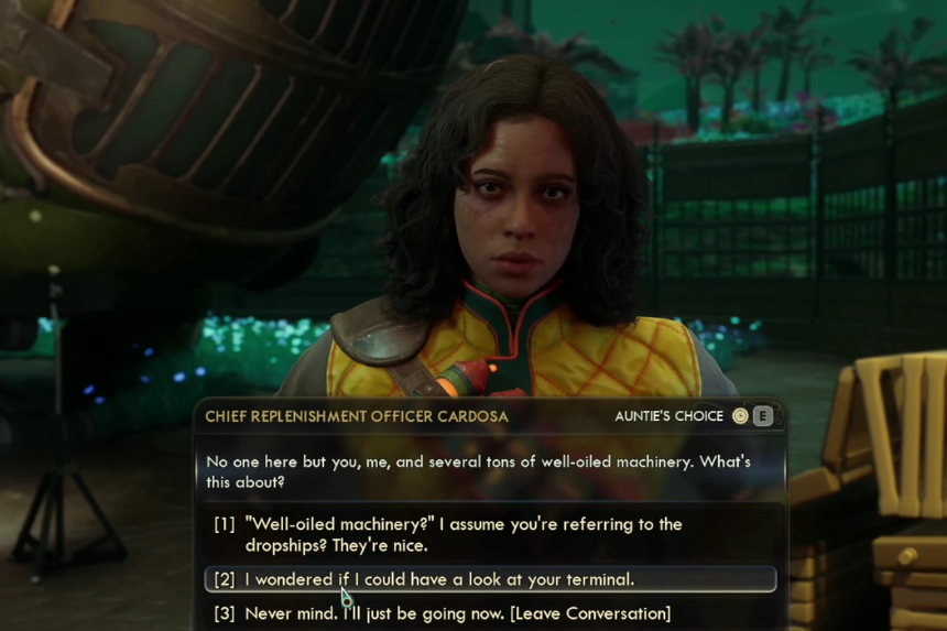 Se possiedi l’abilità Discorso 2, puoi adottare un approccio più fluido. Inizia allo stesso modo dicendo che potresti usare qualche nuova attrezzatura o che non fai parte di Auntie’s Choice. Poi dille che hai una questione privata di cui parlare e chiedile se puoi dare un’occhiata al suo terminale. Quando ti interroga, scegli la riga del Discorso 2 che menziona “terribili mangiatori di uomini che metteranno la paura del fogliame in ogni contadino del Protettorato”. Se scegli questa opzione, potrai prendere la keycard senza che venga considerata un furto.