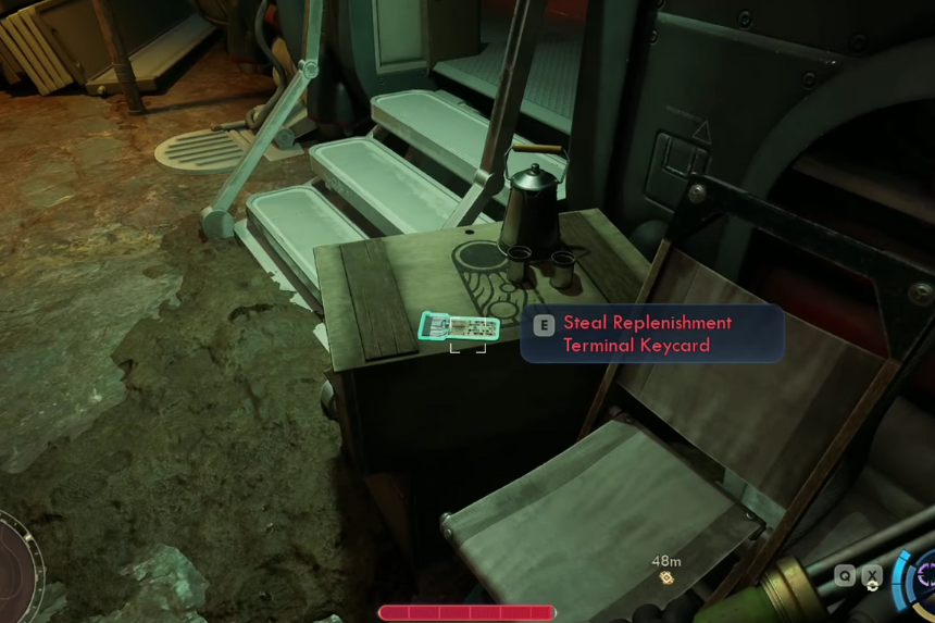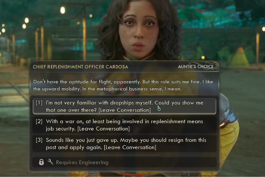 Se non disponi di vantaggi di abilità, il modo più semplice per ottenere la chiave magnetica è distrarre Cardosa. Inizia parlandole e scegliendo opzioni di dialogo che la facciano distogliere lo sguardo. Dille che sei interessato a nuovi equipaggiamenti o dille che non sei ufficialmente con Auntie’s Choice. Quindi, commenta quanto sono belle le navi da sbarco, chiedi cosa le impedisce di perseguire il suo sogno e, infine, dì che non hai familiarità con le navi da sbarco e chiedile di mostrartene una nelle vicinanze. Una volta che si dirige verso la nave, aspetta finché non guarda e non c’è nessun altro in giro, quindi prendi rapidamente la chiave magnetica.