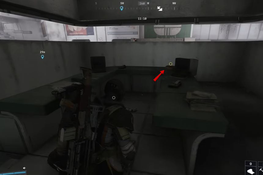 All’interno della hall troverai i cancelli di sicurezza. Da lì svolta a sinistra per trovare una stanza contrassegnata con il cartello “Accesso limitato di sicurezza”. Entrate nella stanza e girate a destra. Questo è il punto di controllo di sicurezza. Sul bancone all’interno troverai i documenti che devi cercare. Interagisci con loro.