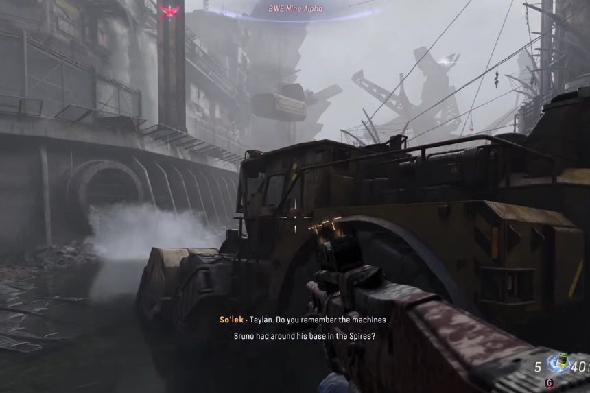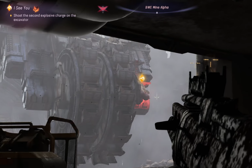 Alla fine del percorso, sali sul tubo e oltrepassa i binari per raggiungere l’area aperta. Vedrai Zari in piedi sopra l’escavatore oltre l’edificio davanti a te e continuerà a spararti. Per affrontarla facilmente, avvicinati il più possibile rimanendo al riparo, quindi spara alla mina rossa luminosa attaccata alla struttura.